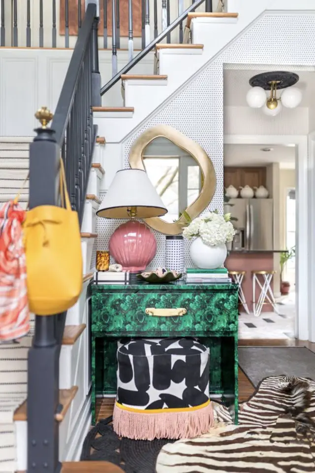 Si on revient à une gamme de déco qui ne coute pas trop cher pour relooker l'entrée, on peut parler des luminaires. Comme c'est une pièce assez sombre la plupart du temps, ils ont un rôle essentiel à jouer. On a le luminaire principal généralement au plafond. On peut aussi ajouter des luminaires d'appoint comme une lampe à poser sur la console, des appliques murales qui éclaireront votre couloir d'entrée, etc. J'ai développé cette thématique ici si vous souhaitez approfondir le sujet.