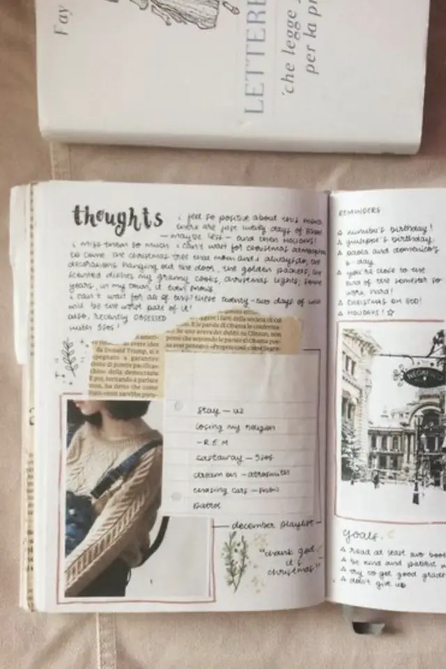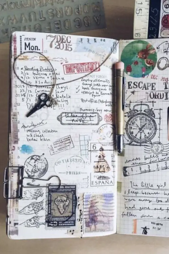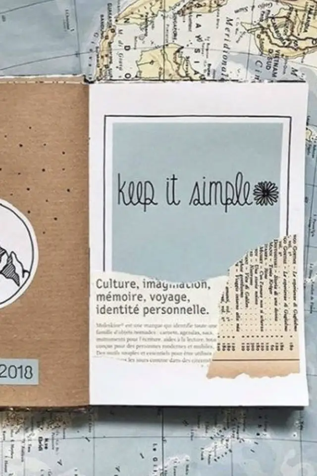 15 • Collage de lettres découpées dans un magazine, carte d'une île japonaise, style vestimentaire rencontré en voyage, dessin de nourriture... Tout peut être prétexte à décorer votre Travel Notebook.