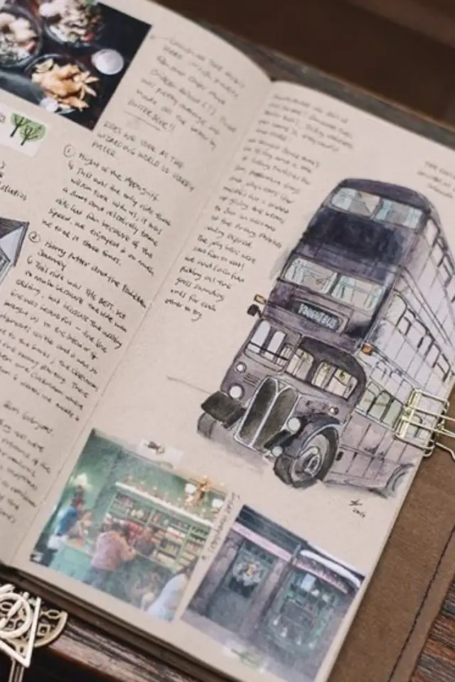20 • Les symboles en voyage sont nombreux et différents pour chaque pays. Ici on reconnait en un clin d'oeil Londres avec ses bus à 2 étages. Et l'aquarelle donne un effet très poétique au souvenir.