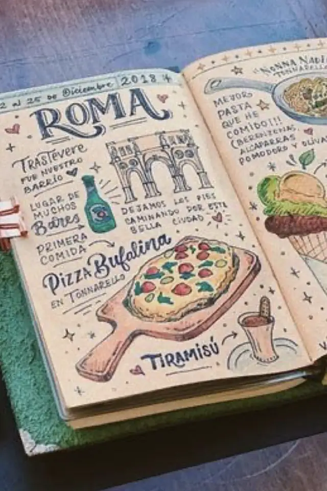 11 • S'inspirer de ce qu'on a mangé à l'étranger pour décorer son carnet de voyage - ici Rome avec un tas de choses qui semblent bonnes (et si vous me suivez sur Instagram, vous savez que la bouffe est importante dans mon voyage)