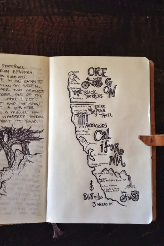 22 • Tenir son carnet de voyage dans l'autre sens pour faire un résumé des lieux visités avec une carte pour tout voir en un clin d'oeil (sans avoir à retourner le notebook pour lire!)