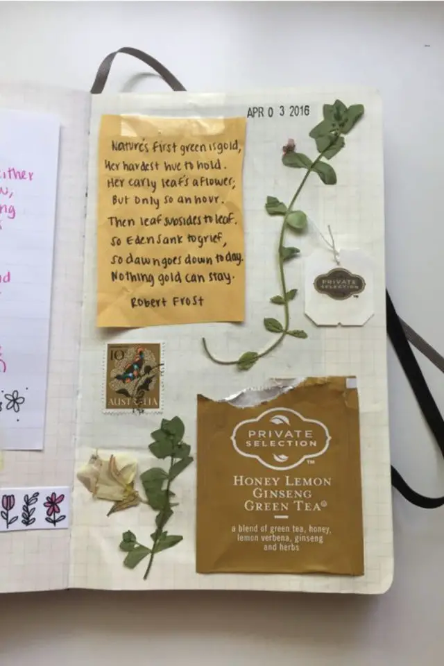 24 • A l'image d'un herbier, on peut garder quelques fleurs ou herbes d'un voyage. Il suffit de les faire sécher avant de les intégrer dans votre journal de voyage. Ici, il y a aussi un sachet de thé, un timbre. Le texte est lui aussi un élément de déco.