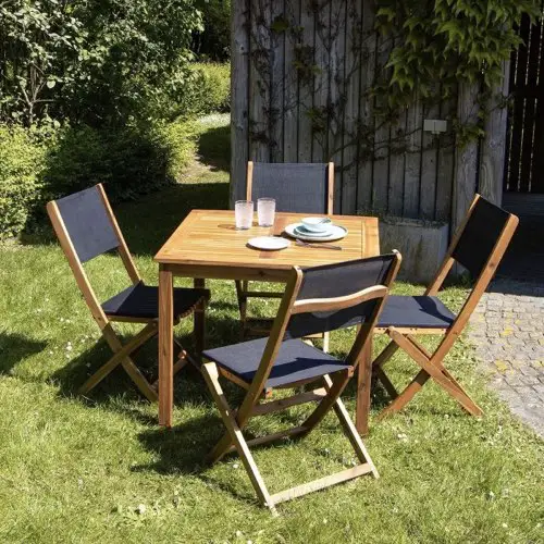 - les chaises: avec ou sans accoudoirs ou encore un modèle qui offre la possibilité de les empiler pour les ranger en saison basse.