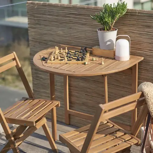 - Un ensemble table + chaises, en général 2, souvent pliables, en bois ou en métal. Cela vous permet de prendre le petit déjeuner par exemple sur votre balcon.