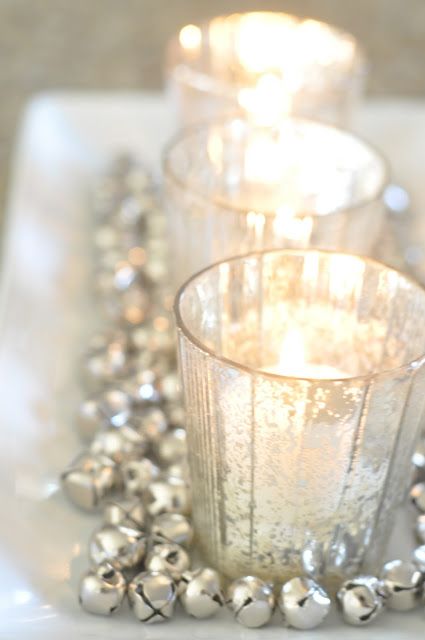 Il vous faut -> une jolie assiette blanche rectangulaire, des grelots (comme ceux des rênes), des photophores argentés, des bougies chauffe plat