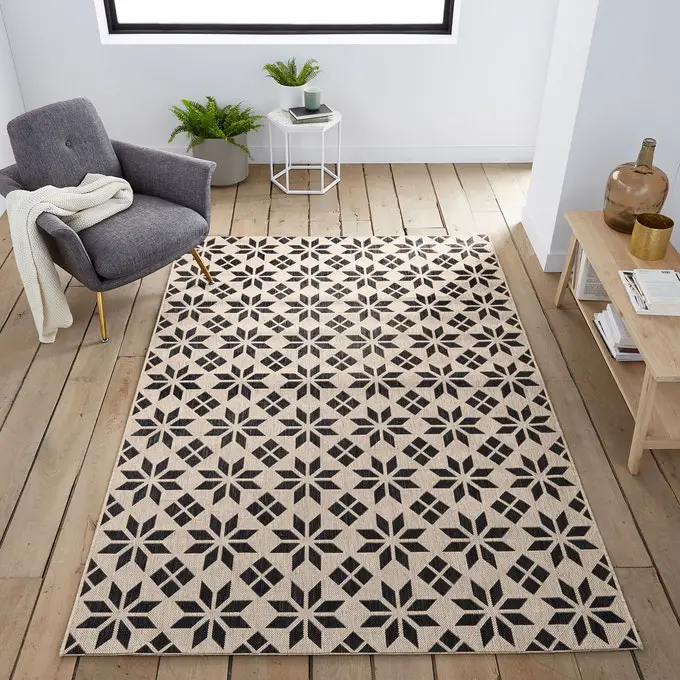 J'adore l'effet des carreaux de ciment dans la déco, en revanche, poser ce type de revêtement demande parfois des travaux qui ne sont pas prévus et qui ne rentrent pas dans vos projets. Alors, si on aime les motifs des carreaux de ciment, on peu les retrouver sous différentes formes, comme sur un tapis. Il existe des tapis vinyles faciles d'entretien pour les lieux qui se salissent vite comme l'entrée ou encore la cuisine. Mais le vinyle n'est pas la matière la plus chaleureuse. Dans le salon par exemple, on préfèrera un tapis en laine, tout doux sous les pieds.