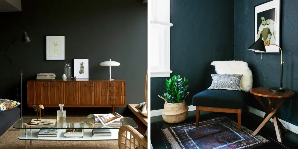 Qu'elle soit sur les murs, sur les boiseries ou encore une partie de votre mobilier, selon là où elle se trouve et la quantité dans laquelle elle se trouve, la couleur foncée n'aura pas le même rendu dans votre pièce. Elle n'assombrira pas de la même manière votre intérieur. Et l'interaction entre les matériaux et la couleur ne sera pas la même.