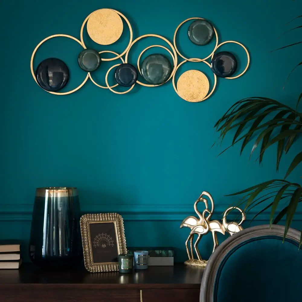 Avec la tendance des couleurs foncées dans la déco viennent aussi d'autres idées déco. Un peu comme un pack 2 en 1. Et très souvent dans les intérieurs à dominante foncée, on retrouve les matériaux métalliques: or, cuivre, laiton... Ils vont apporter une certaine brillance aux couleurs sombres, surtout si elles sont mates. Un luminaire doré sur un mur foncé va apporter de la luminosité, de l'éclat. Ce qui est intéressant avec cette association couleur sombre et métal, c'est qu'il n'y a pas besoin d'en faire des tonnes. Le métal peut se retrouver sous la forme de petits détails comme un pied de lampe, le piètement d'une table ou d'un fauteuil, l'encadrement d'un miroir... Et ce sera suffisant pour créer une source de luminosité et de contraste avec une couleur foncée.