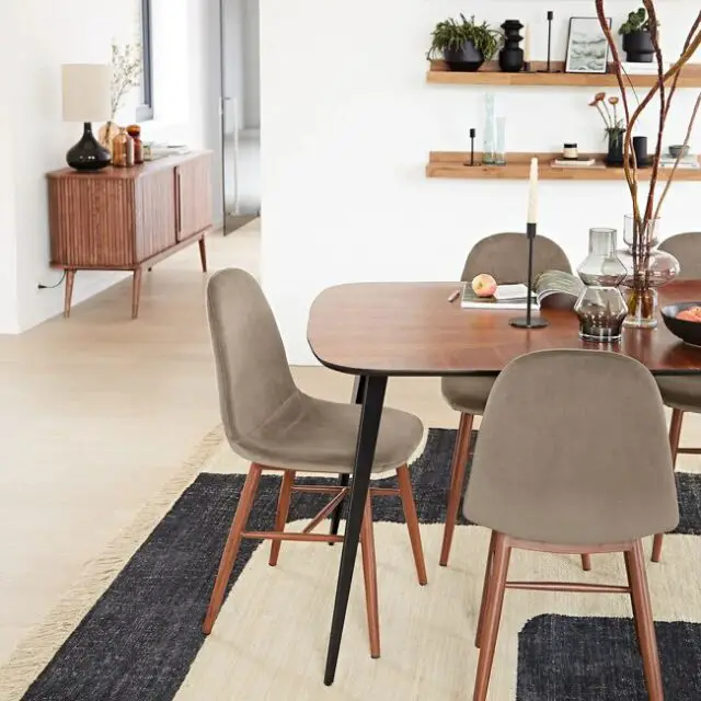 Le noir pose des problèmes à beaucoup de monde. Pas que les gens n'aiment pas cette couleur mais elle semble plus délicate à intégrer dans la déco en partie à cause de son symbolisme parfois un peu lugubre. J'aime le noir en matière de mode ou en matière de design d'intérieur donc pour moi c'est assez facile de l'utiliser. Le noir est raffiné et élégant. Il apporte une sorte de subtilité dans la déco, il sert d'ailleurs beaucoup pour rehausser une harmonie de couleurs un peu fade. C'est comme un point d'orgue contemporain. Faire le choix de chaises en velours noir autour de la table vous permettra de mettre en valeur votre décoration existante et apportera une touche moderne à la salle à manger.