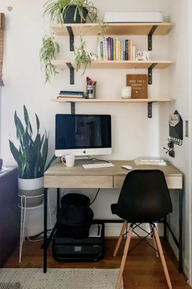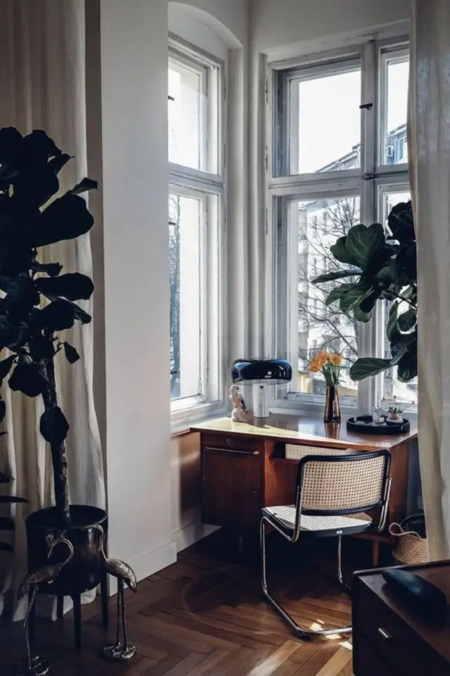11 • Une nouvelle fois, nous sommes dans le cas d'un bureau installé dans un angle de pièce. Mais ce qui m'intéresse est un détail, c'est la plante juste à côté du bureau. Elle apporte un côté naturel à la déco et au cadre de travail. Mais surtout, elle le dissimule en partie, elle le rend moins visible. Elle fait aussi office de séparation entre le bureau et le reste de la pièce.