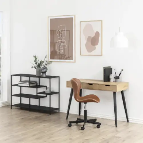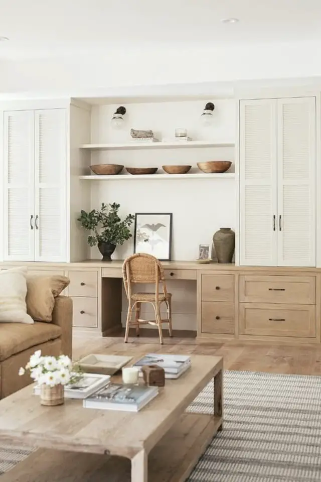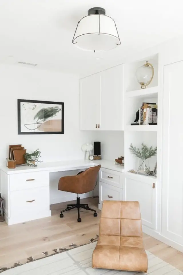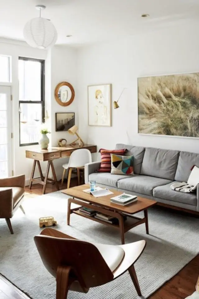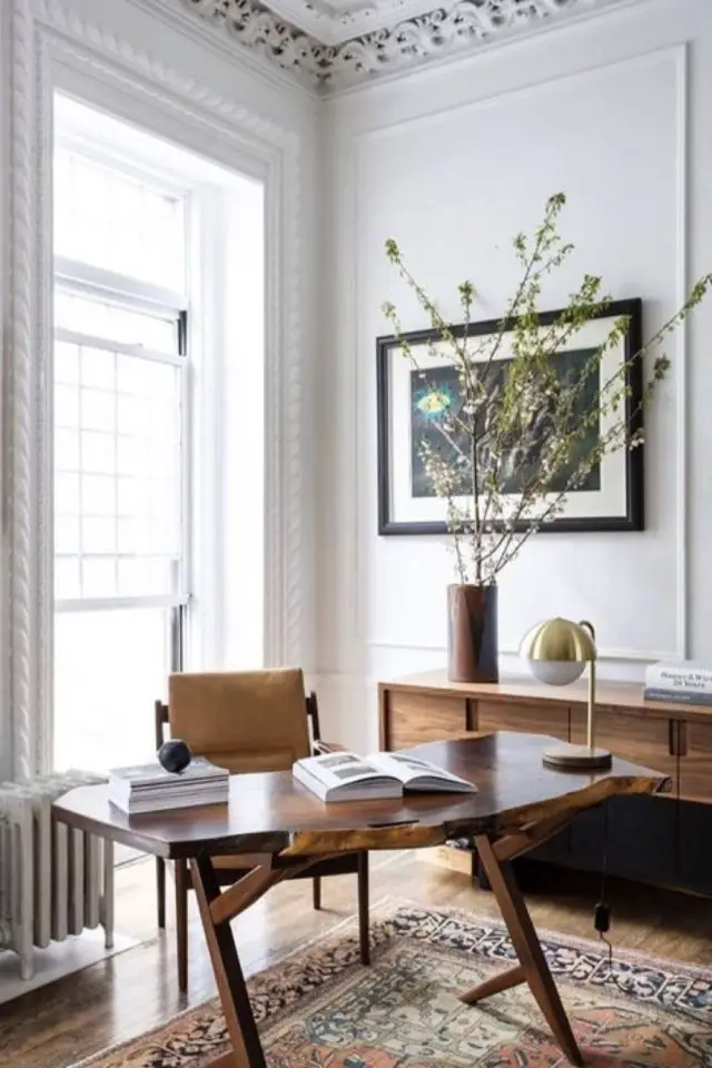 Ici, le bureau est en bois avec une petite allure rétro qui fait écho à la table basse mid century ou au fauteuil design de la même époque. Par ailleurs, le blanc de la pièce à vivre confère au bureau un côté lumineux agréable pour travailler.