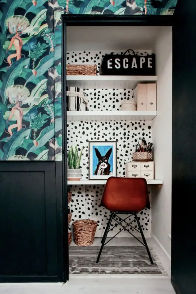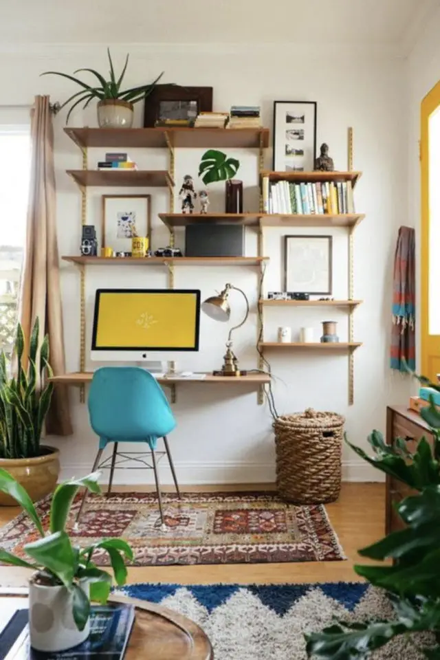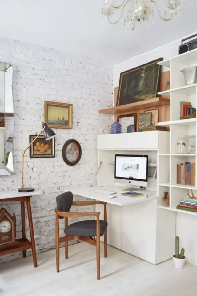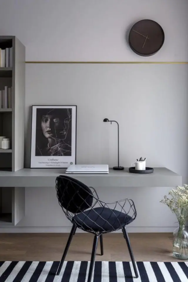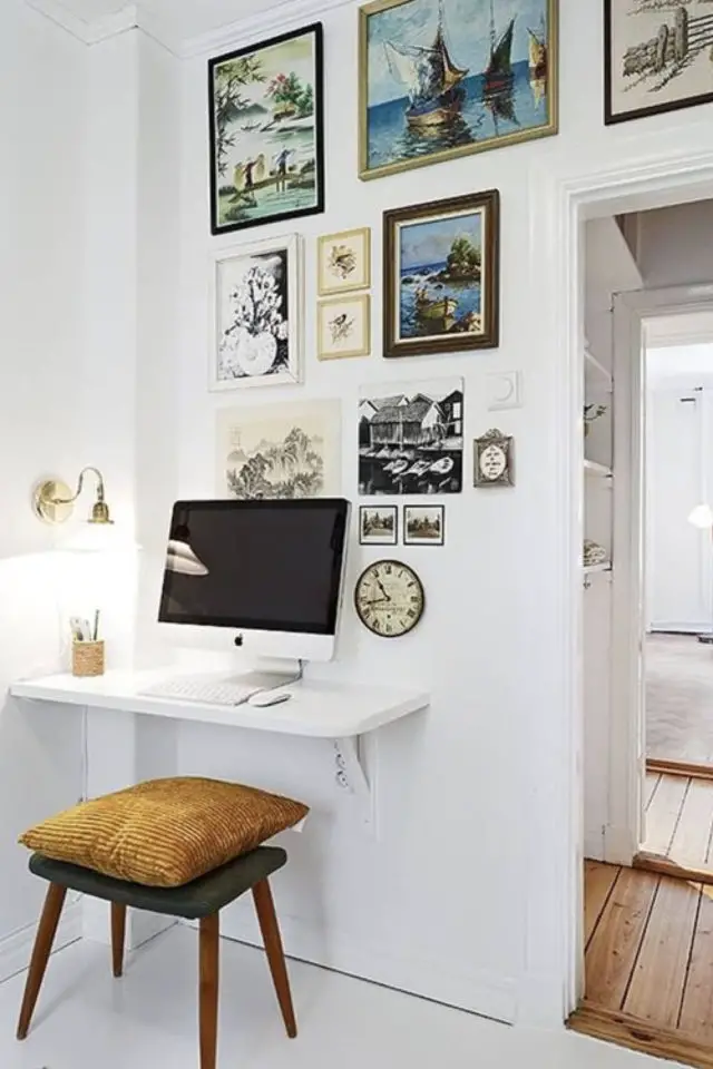 20 • Dernier bureau: une tablette murale peinte en ton sur ton. En plus d'être vraiment peu encombrante, elle disparait en se confondant avec le mur. C'est une solution pratique à la fois pour les petits espaces et les petits budgets.