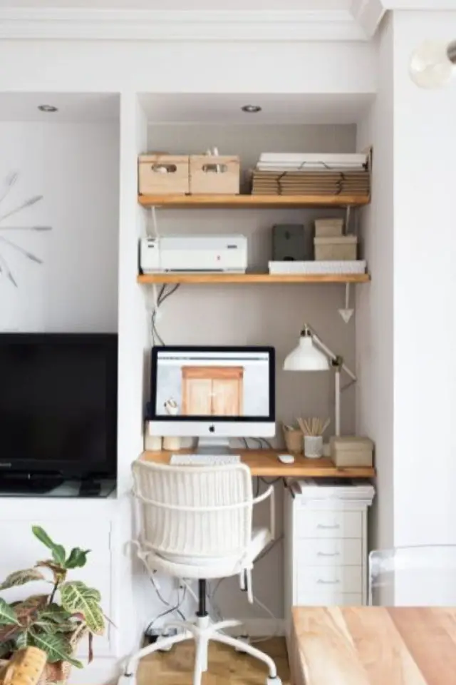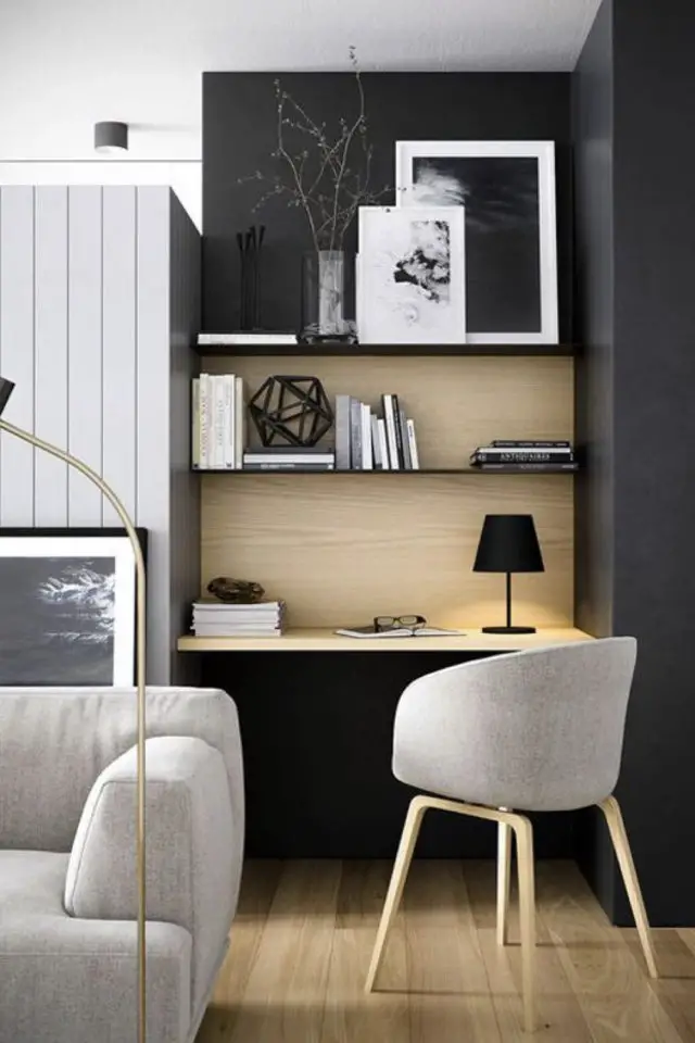 05 • Parfois dans le salon, il y a une alcôve ou une espèce de placard qui doit être aménagé. En France c'est assez fréquent dans les locations HLM. Cet espace peut très bien être l'occasion de créer un poste de travail qui ne sera pas totalement dans la pièce à vivre. S'il est assez profond, vous pouvez même installer un rideau pour le cacher en dehors des heures de boulot. Si vous optez pour cette solution, n'oubliez pas la lampe de bureau. Ce sont généralement des espaces un peu sombres et la luminosité est primordiale pour ne pas se fatiguer au quotidien.