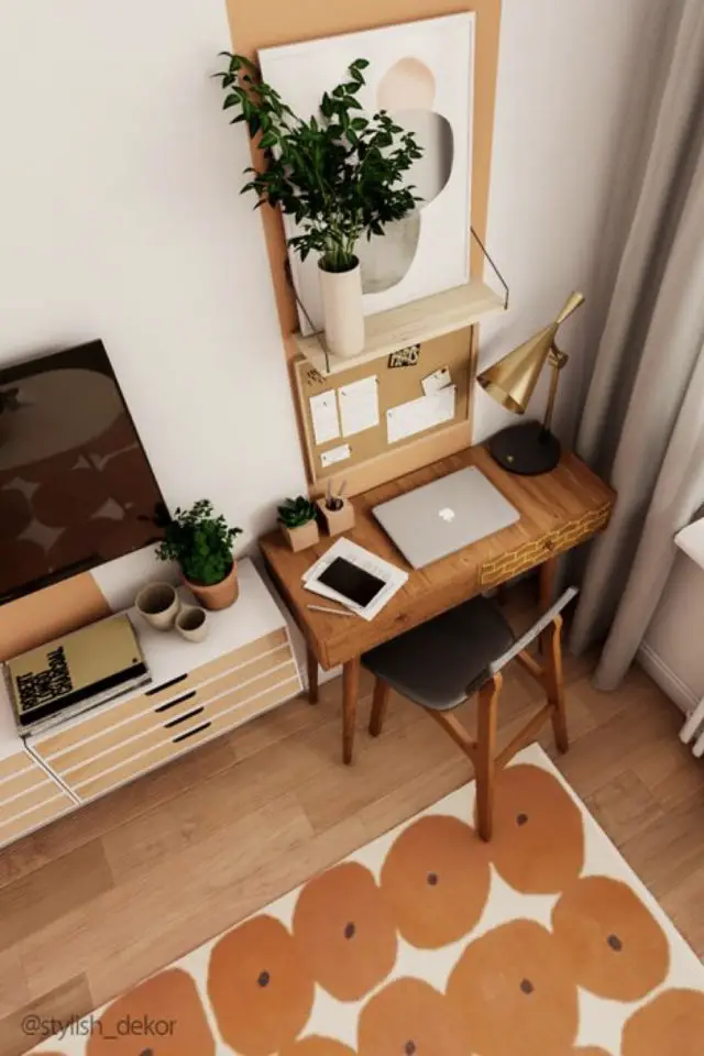 06 • Comme dans la 4ème image, le bureau trouve sa place à côté de la télévision. C'est un bureau compact qui n'encombre pas et qui peut facilement se trouver dans un petit salon. Ce qui est intéressant, c'est le moodboard en liège qui le surplombe. En plus de légitimer la place du bureau dans la pièce à vivre, il permet de grader à vue les notes et les papiers qui ne doivent pas être perdus. Au dessus du moodboard, on a une étagère et une jolie affiche moderne. Et c'est la peinture en vertical qui harmonise l'ensemble. La peinture reprend la couleur du tapis pour créer une certaine continuité.