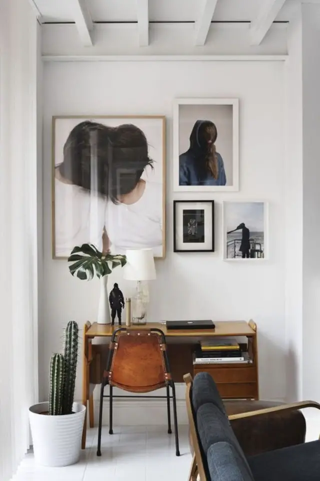 12 • Dans cet autre décor de pièce à vivre où on a intégré un espace de travail, c'est la décoration murale qui m'interpelle. C'est un ensemble de cadres que l'on retrouve plus facilement dans un salon / séjour que dans un bureau. Surplombant ce dernier, la décoration murale tend à attirer plus le regard que le meuble bureau et donc elle l'efface en partie. Le bureau a une importance moindre dans la pièce de vie.