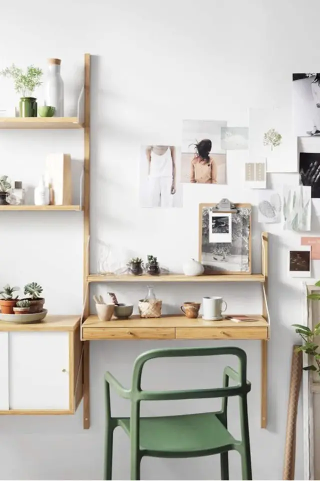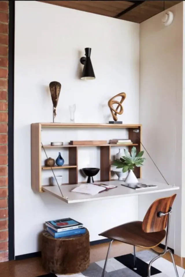 19 • On arrive à la fin de cette sélection d'idées à copier pour créer un espace travail dans la pièce à vivre. Et pour l'avant dernier bureau, je devais parler des bureaux muraux. Contrairement à l'image précédente, on est sur un modèle de type secrétaire qui se ferme et disparait quand on en e a envie. Pour moi c'est un critère essentiel quand on veut faire la part des choses entre le boulot et le perso.