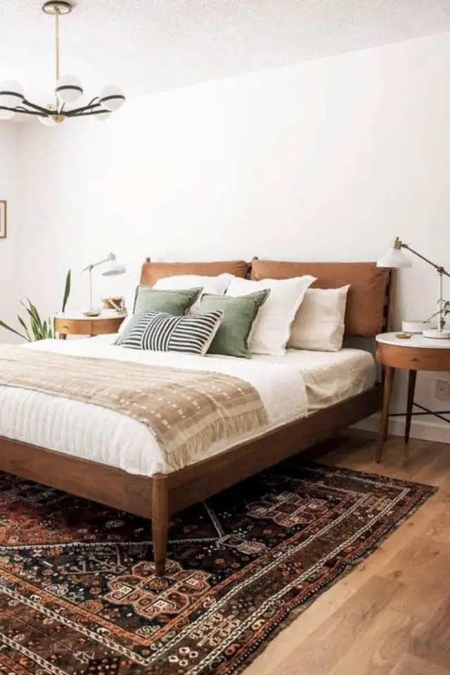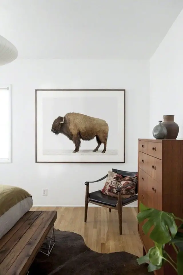 Un peu moins commun mais très moderne, l'association du cuir et du bois se retrouve dans la chambre à coucher: un fauteuil dans l'angle d'une pièce, une tête de lit en cuir...