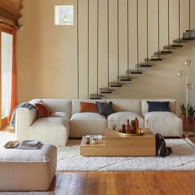 D'abord, j'aime particulièrement le côté modulable qui colle à tous les salons - petits comme grands. On crée une assise qui correspond parfaitement à la pièce mais aussi à nos besoins. Ensuite, je suis séduite par son allure un poil vintage mais surtout très cosy. Il n'y a pas de piètements visibles, les coussins sont rebondis à souhaits. La couleur est neutre et douce. Tout cela contribue à la sensation de confort que l'on cherche à créer dans une pièce de vie.