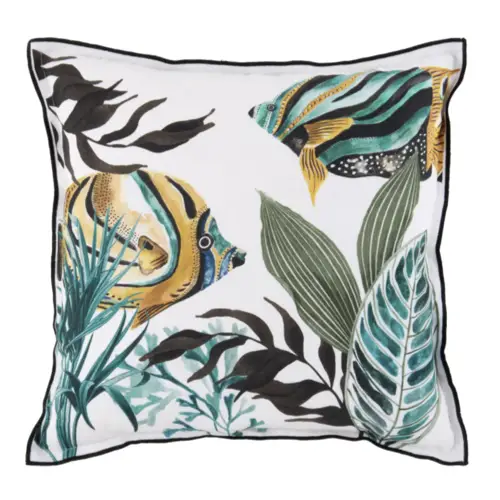 26 • Housse de coussin en coton imprimé poisson écru, vert et jaune - Maisons du Monde