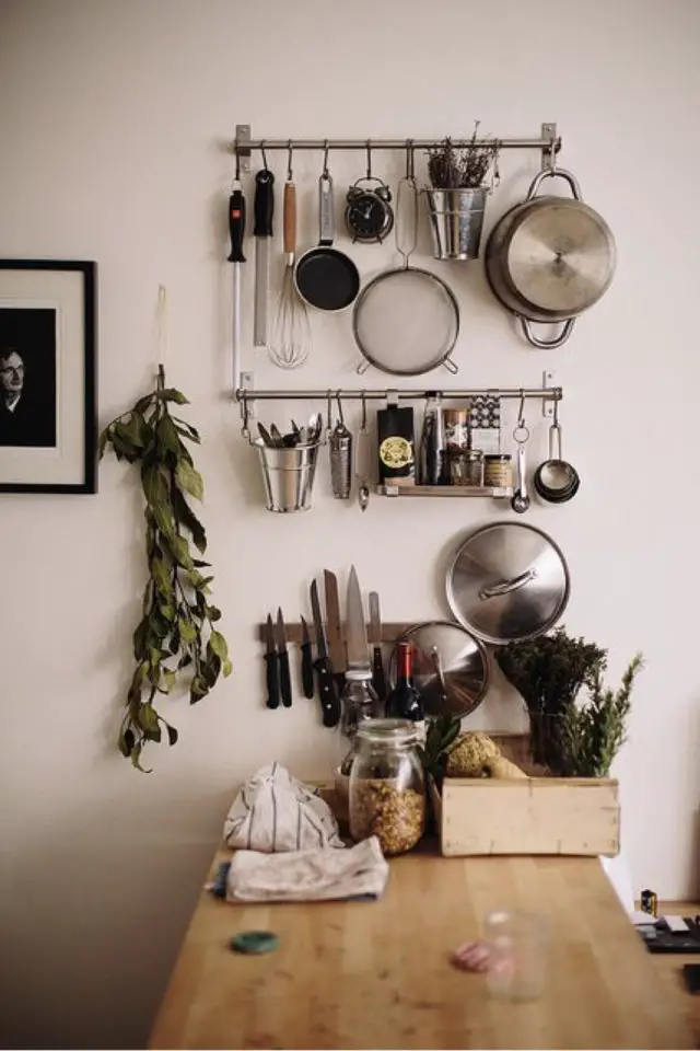 Je termine cet article avec une thématique que j'ai déjà plus ou moins évoquée il y a quelques semaines dans un de mes précédents Weekly Inspirations (le point n°4 de cet article): la déco murale dans la cuisine, notamment les accessoires de cuisine qui servent autant à décorer qu'à préparer les repas. Si cette thématique revient dans mon esprit et du coup sur le blog c'est parce que je manque de temps pour préparer un article que j'ai en tête depuis un moment. Donc en attendant, je m'inspire et je laisse mijoter mes idées déco au fond de mon esprit. Je crois que dans chacune de mes cuisines, il y avait des éléments suspendus, notamment les ustensiles de cuisine et les couteaux. J'aime avoir sous la main ce qui est nécessaire pour cuisiner et ne pas avoir à m'embêter à ouvrir les tiroirs surtout quand on a les mains dans la bouffe. J'aime ce côté pratique et simple. Et en bonus, cela décore les murs de la cuisine!