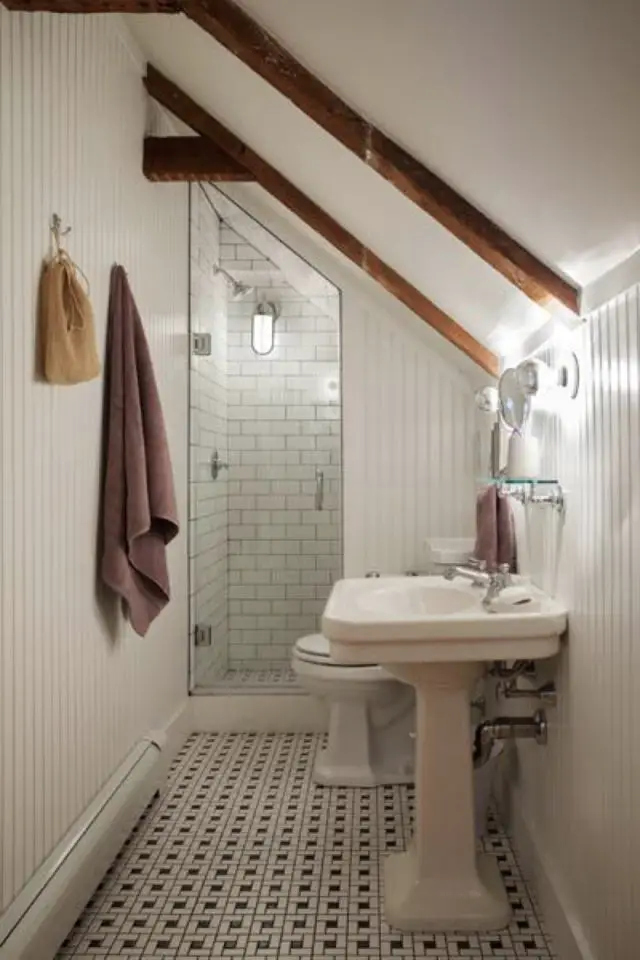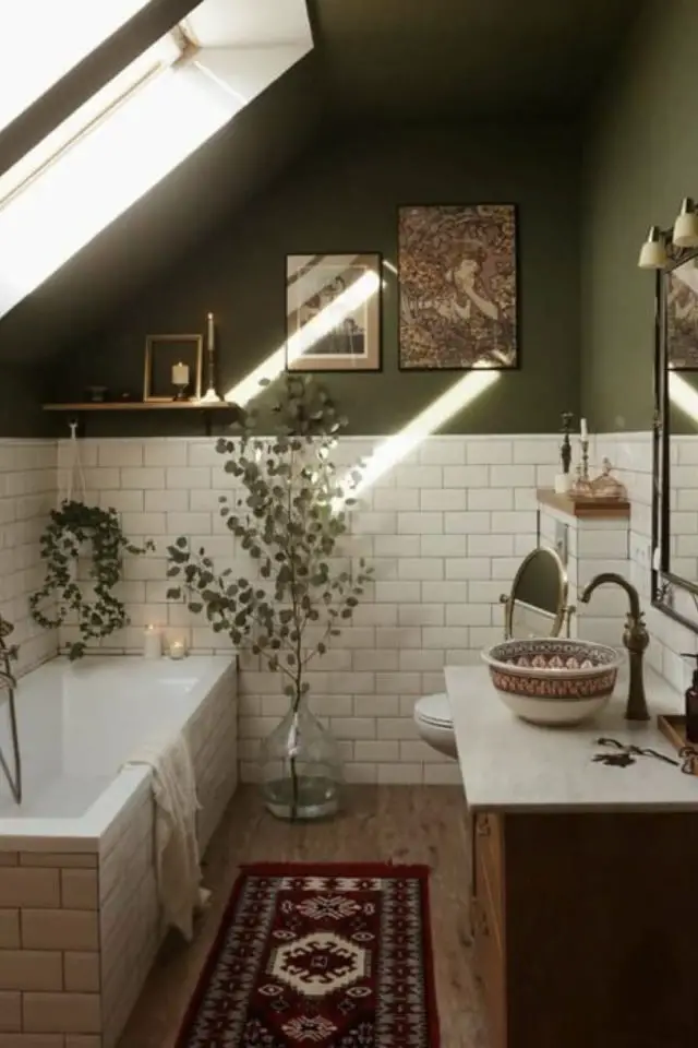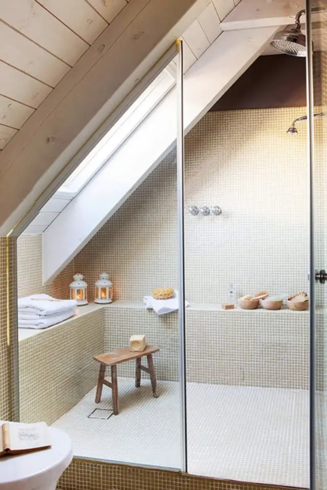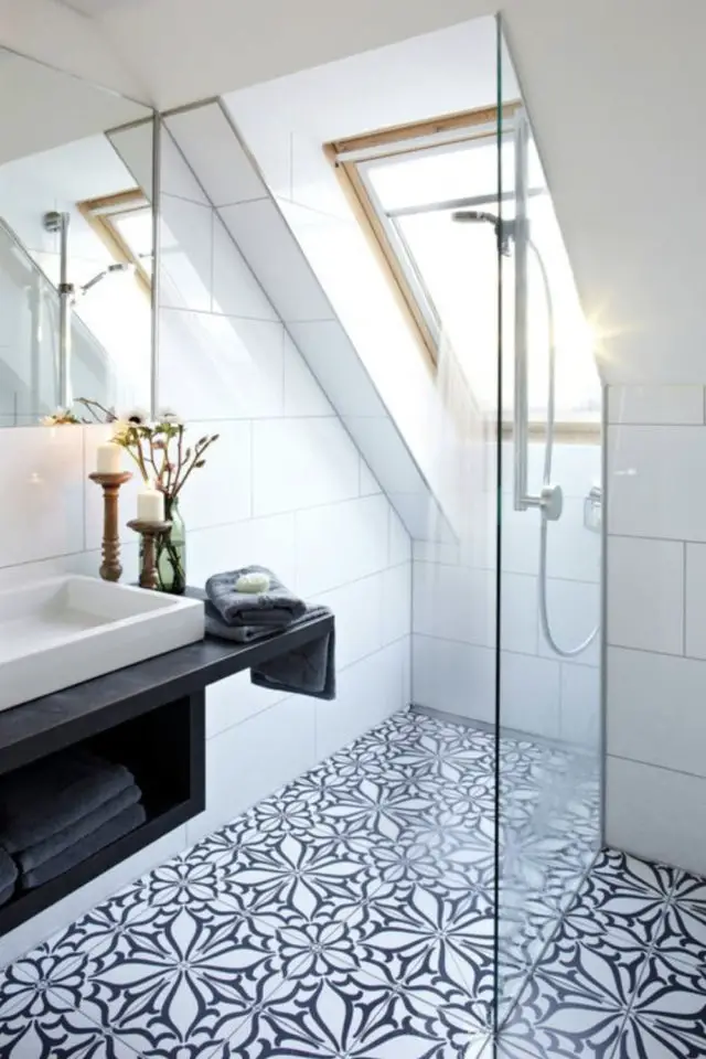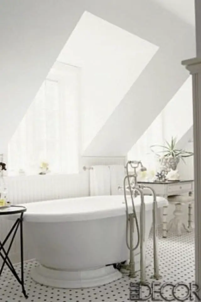 Une nouvelle semaine, une nouvelle dose d'inspirations pour un quotidien déco! Vous connaissez la chanson... J'espère que ma semaine sera plus productive que la semaine précédente. A chaque fois que j'arrive en Inde, il me faut toujours un moment d'adaptation que ce soit d'un point de vue perso comme un point de vue pro. Et je suis fière de moi, aujourd'hui, je ne me suis pas focalisée sur la chambre... Comme il fait chaud, je dors mal, je rêve donc (les yeux ouverts) de chambres agréables et fraiches. S'il n'est pas question de chambre à coucher, de quoi va-t-on parler aujourd'hui? Il va être question de déco murale dans la cuisine, de canapé blanc, d'ambiance seventies. Mais avant cela, on commence avec de petites salles de bain sous les combles. J'espère que cela vous donnera des idées pour chez vous. J'en profite pour vous souhaiter une bonne lecture et surtout une bonne semaine!