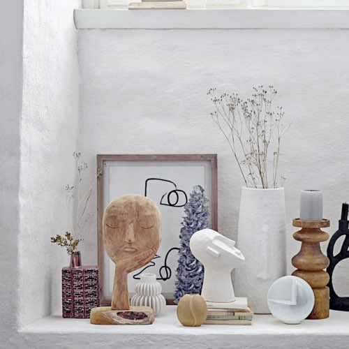 Pour décorer l'appui de fenêtre il y a toute la famille des bustes et statuettes. J'en parle peu sur le blog tout simplement parce que ce n'est pas tout à fait mon genre de décoration. J'aime ce qui est simple, j'aime ce qui ne me demande pas de faire les poussières tous les jours. Pourtant, ces objets déco sont parfaits pour donner beaucoup de personnalité voire d'élégance à une surface plane. Cela est valable pour le dessus du buffet tout comme l'intérieur de la fenêtre. On peut alors facilement accentuer la décoration déjà présente dans la pièce. La statuette peut renvoyer à un style antique chic, un style bohème qui fait voyager ou pourquoi pas quelque chose de plus organique et abstrait.