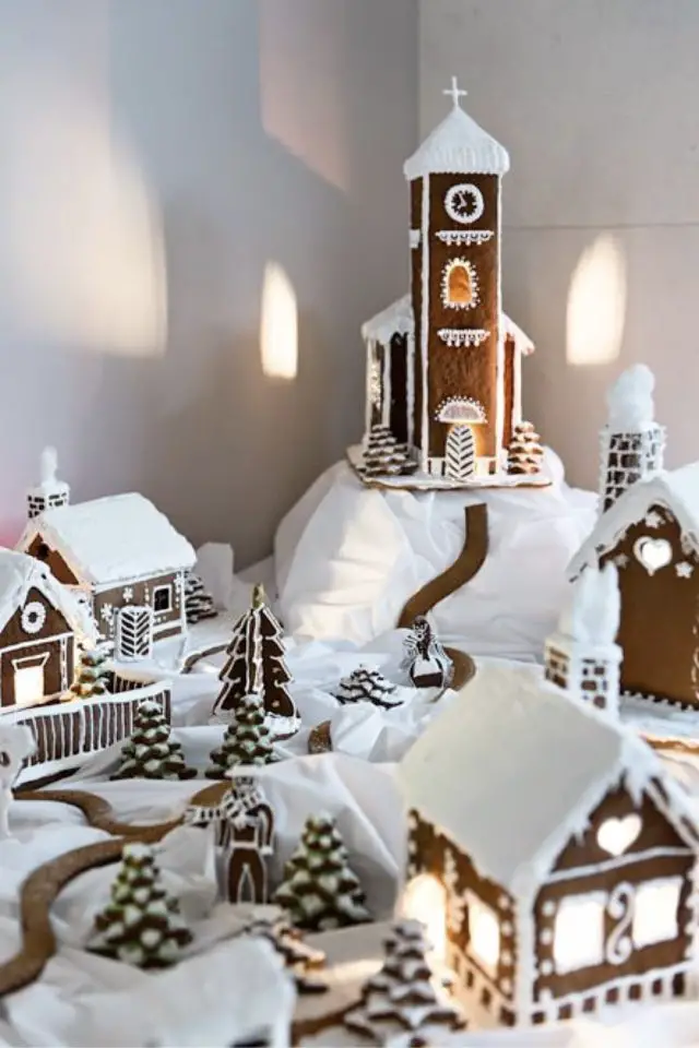 La déco de noël gourmande en pain d'épice peut être la base de votre décoration de table. Cela change des éternelles buches de noël avec des bougies. Avec du tissu blanc (pour créer un manteau neigeux), quelques petits sapins, des pommes de pin et des maisonnettes, on crée facilement un village en guise de chemin de table.