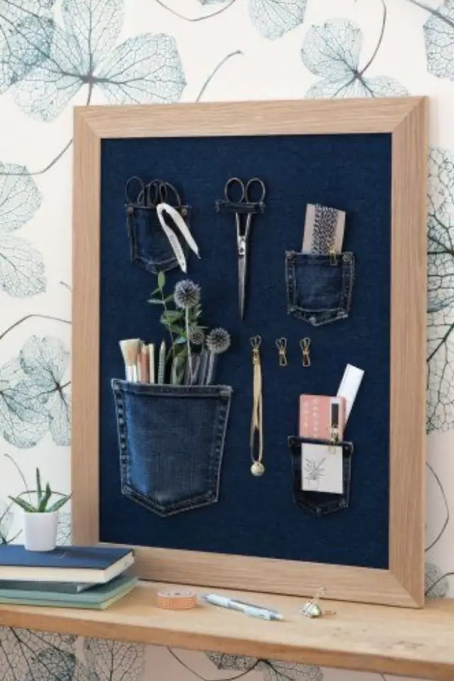 Il y a un côté assez ludique aussi à récupérer de vieux jean's pour créer de la décoration grâce aux poches. Elles peuvent être l'occasion d'avoir un appoint de rangement dans le bureau ou encore pourquoi pas dans la salle de bain. Elles permettent de donner une place au petit bazar qui traine au quotidien. Vous verrez à la fin de cet article dans mes inspirations que les poches de jean's peuvent trouver leur place à table comme pochette pour les couverts.
