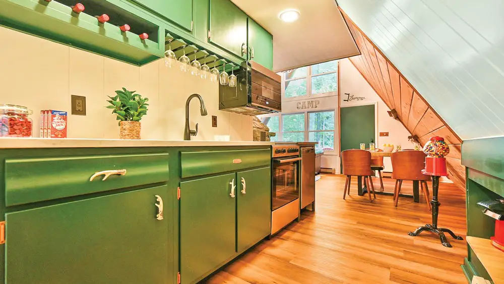 Etant une grande fan de vert, j'ai un coup de coeur pour la cuisine qui reprend la couleur de la façade et à l'intérieur la couleur de la porte d'entrée. Cet espace de préparation des repas est intéressant parce qu'il mélange ancien (avec le design des meubles vintage vu l'époque de construction de la maison) et le moderne (avec l'électroménager). Les verres suspendus et le rangement pour les bouteilles permettent de gagner de la place dans cette petite cuisine. Le design vintage des meubles de cuisine n'est pas uniquement un choix esthétique, ce sont les meubles d'origine de ce chalet qui a été construit à la fin des années 60. En plus de faire la part belle au matériaux naturels, il y a une volonté de valoriser les éléments du passé et leur donner une seconde vie.