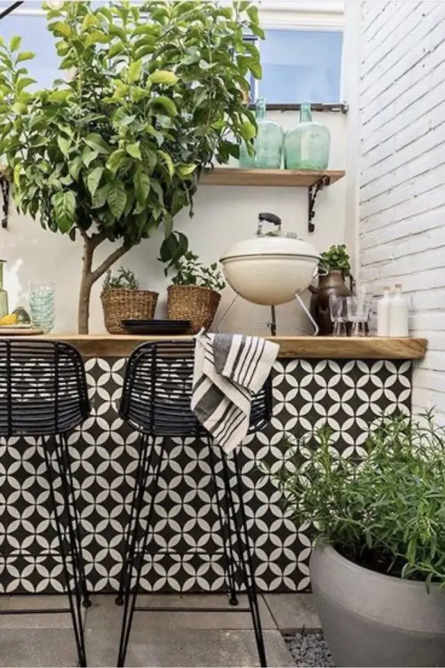 Un joli tapis noir et blanc & des transats en bois pour une courette moderne