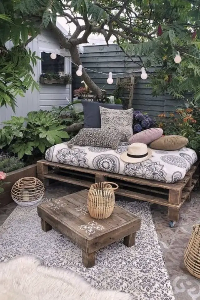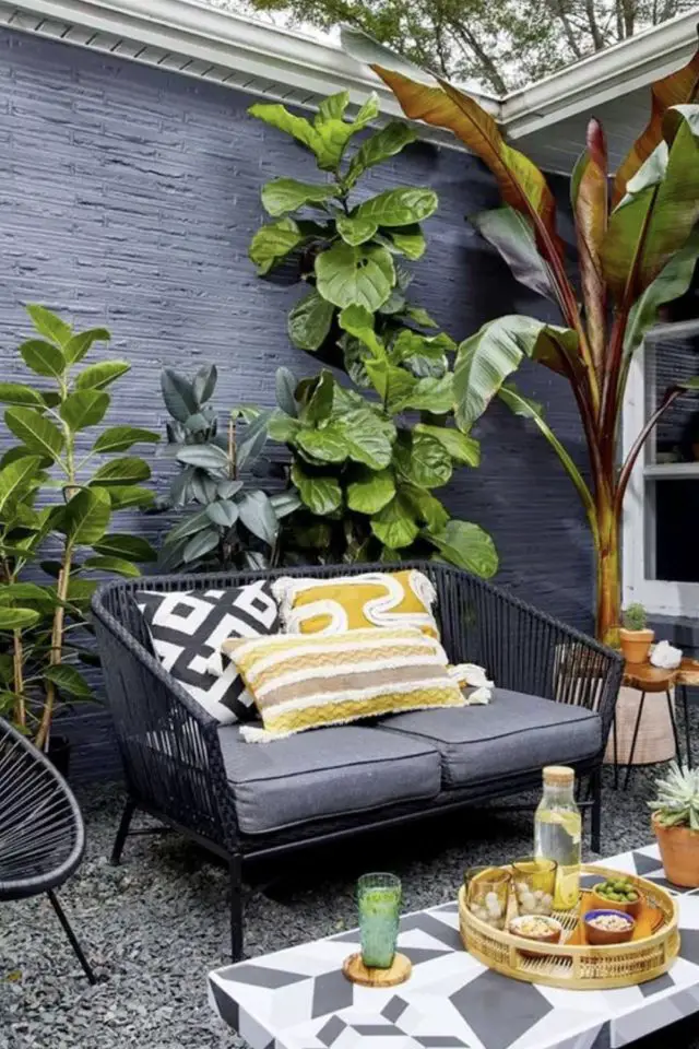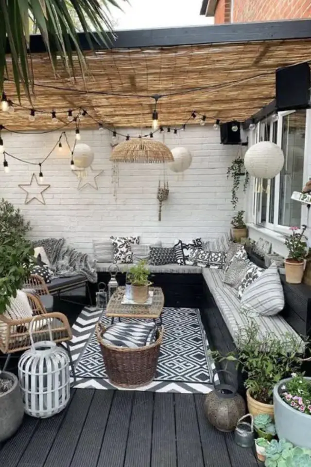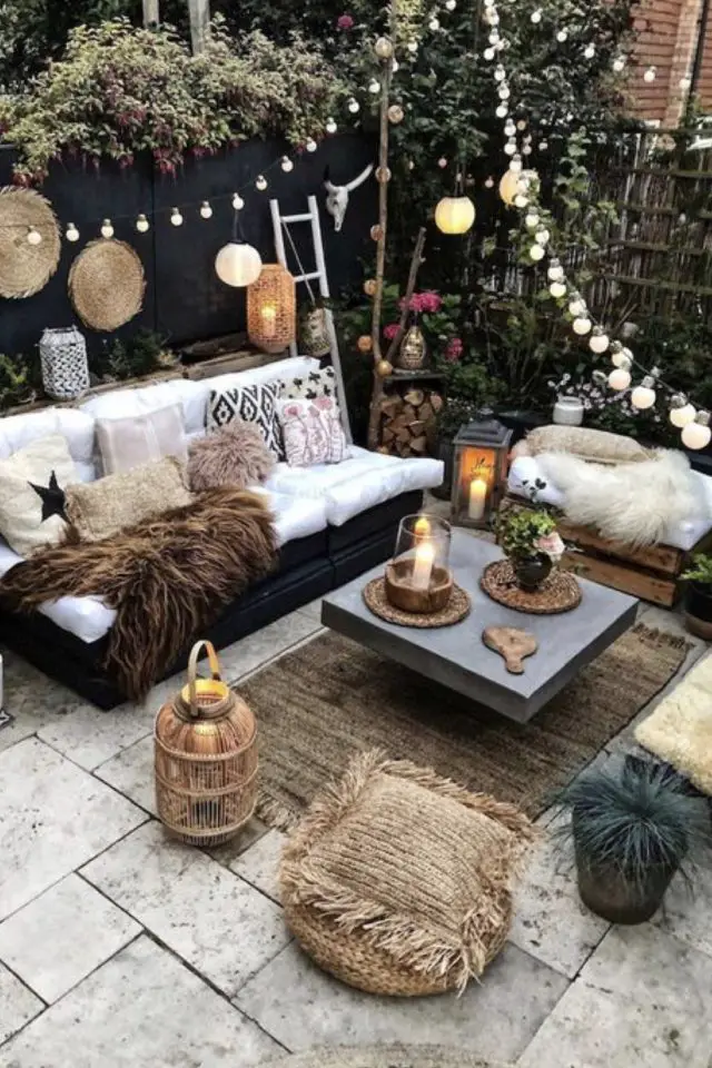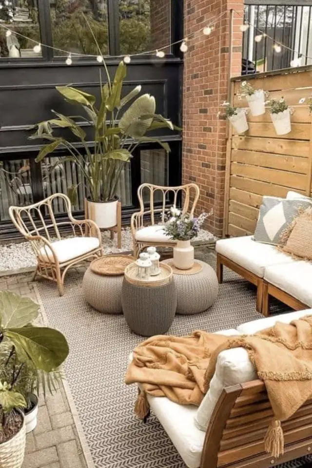Ce petit espace vous offre la possibilité de créer un salon extérieur. Ici, il est question de patio convivial, quoi de mieux alors qu'un salon de jardin pour profiter de la cour dès qu'il fait beau? Dans cet article vous devriez trouver de nombreuses idées pour les meubles qui composeront votre aménagement de patio. Il est assez facile de transformer ce petit espace en salon extérieur: canapés, fauteuils, table basse. On ajoute à cela un tapis pour créer un sentiment plus cosy et délimiter l'espace (comme on peut le faire dans un salon à l'intérieur). Sur plusieurs de mes inspirations, vous verrez aussi qu'il est facile d'intégrer à l'espace des luminaires, notamment des guirlandes lumineuses et des lanternes. En plus de vous permettre de profiter de la cour le soir, les luminaires vont renforcer le sentiment accueillant de votre extérieur.