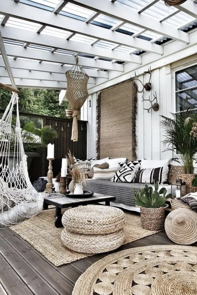 Fauteuils en rotin, banquettes en bois, jute et toile couleur crème pour un patio cosy