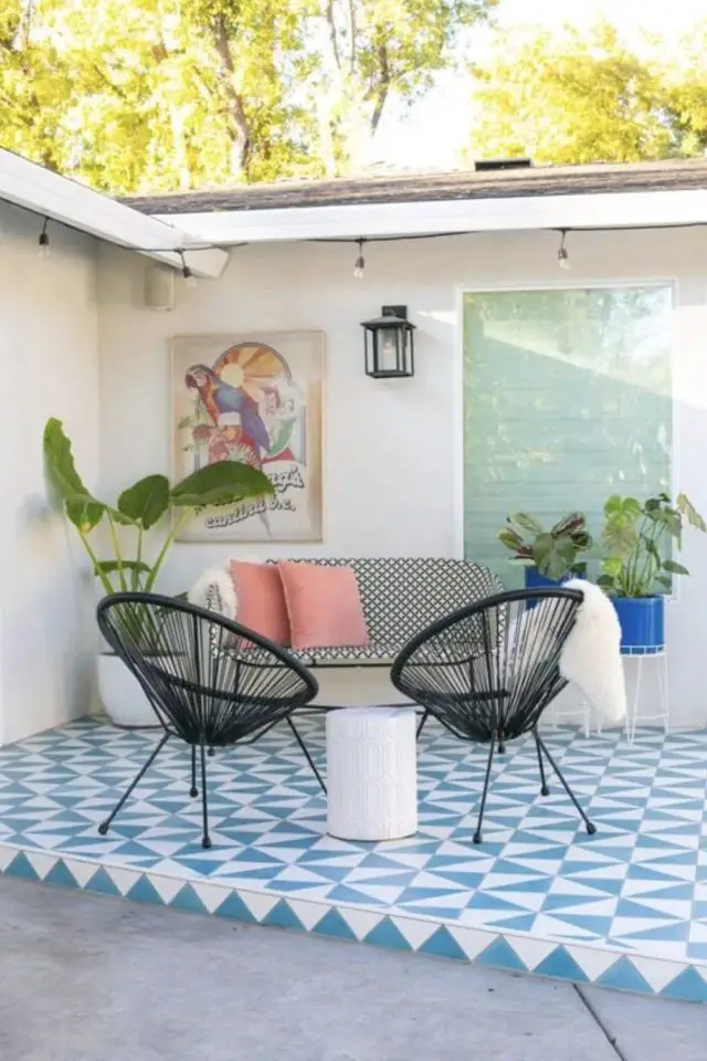 Un sol en carrelage coloré pour délimiter le coin salon en extérieur