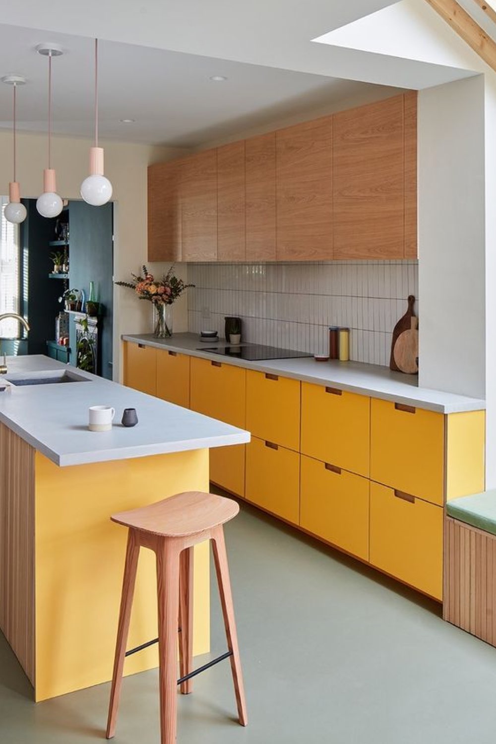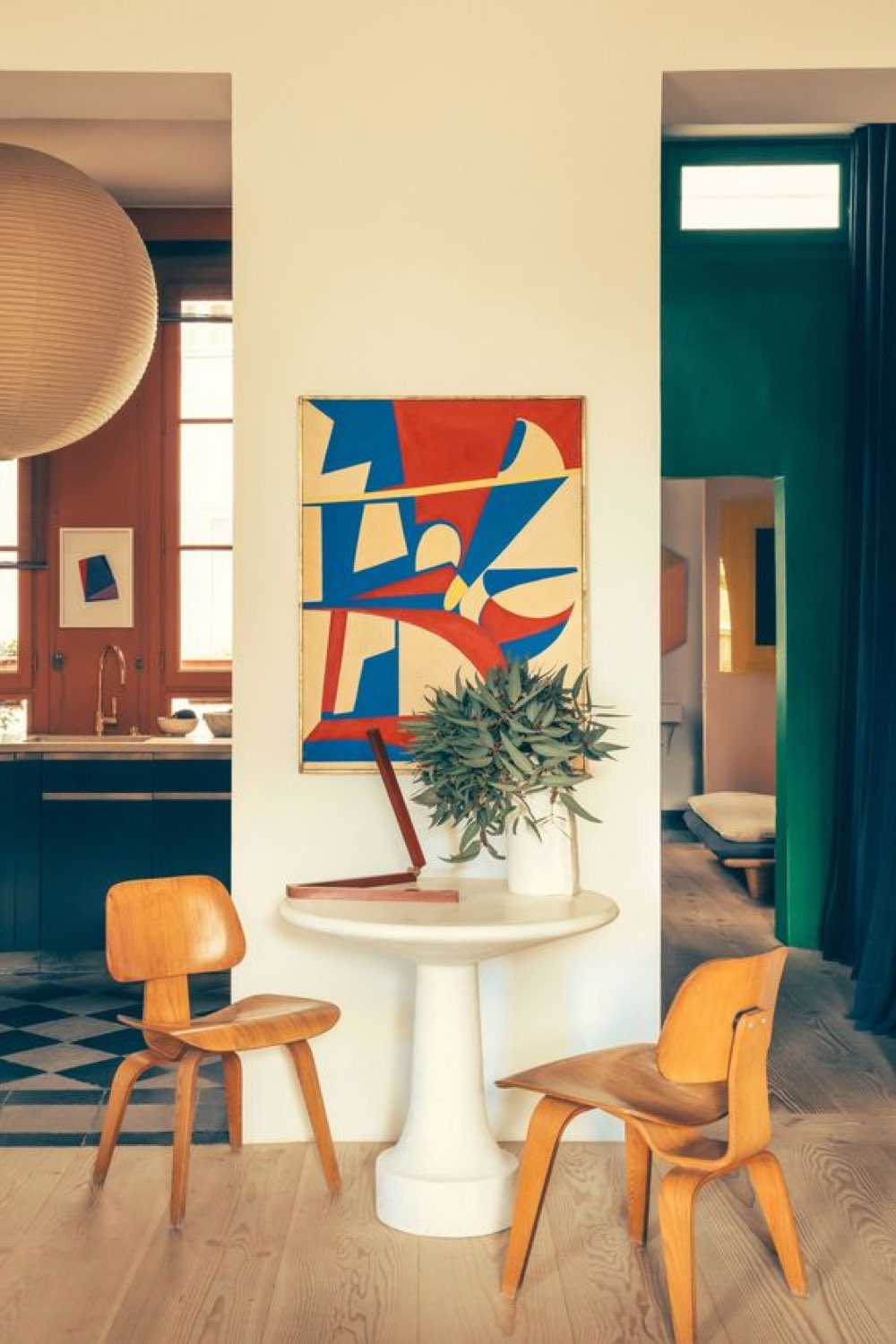 La couleur dans le style Design Modern est souvent vintage. Ce sont des nuances de couleurs qui vont évoquer un temps révolu. On va avoir des couleurs primaires comme celles que l'on trouve dans le mouvement du Bauhaus. On va aussi retrouver des couleurs comme le vert franc que l'on associe facilement aux années 80. Les nuances contemporaines comme le vert sauge ou encore le terracotta ne sont pas tout à fait dans l'esprit Vintage Moderne.