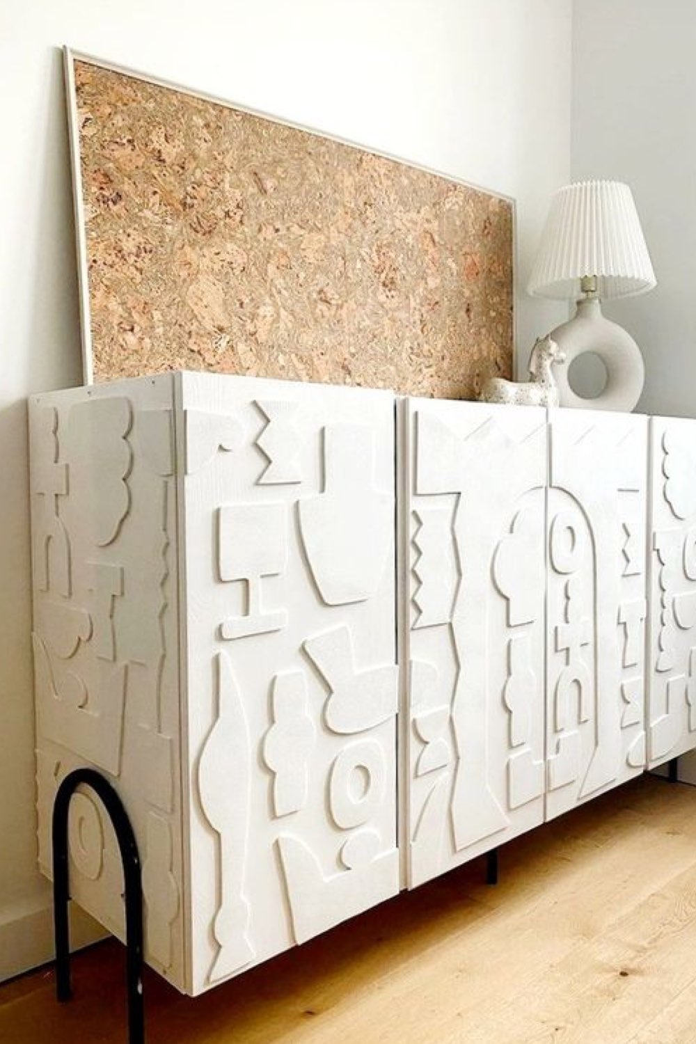 C'est un de mes coups de coeur dans cet article. C'est un relooking simple mais très efficace. Sur une planche de MDF, vous dessinez des formes abstraites, géométriques de tailles différentes. Vous les découpez ensuite avec une scie sauteuse. Un petit coup de papier à poncer pour que ce soit plus propre. Ensuite, vous collez ces formes sur votre meuble et une fois que la colle est sèche, vous peignez le tout dans une seule et même couleur. J'aime beaucoup le côté graphique de ce hack qui est présent mais discret.