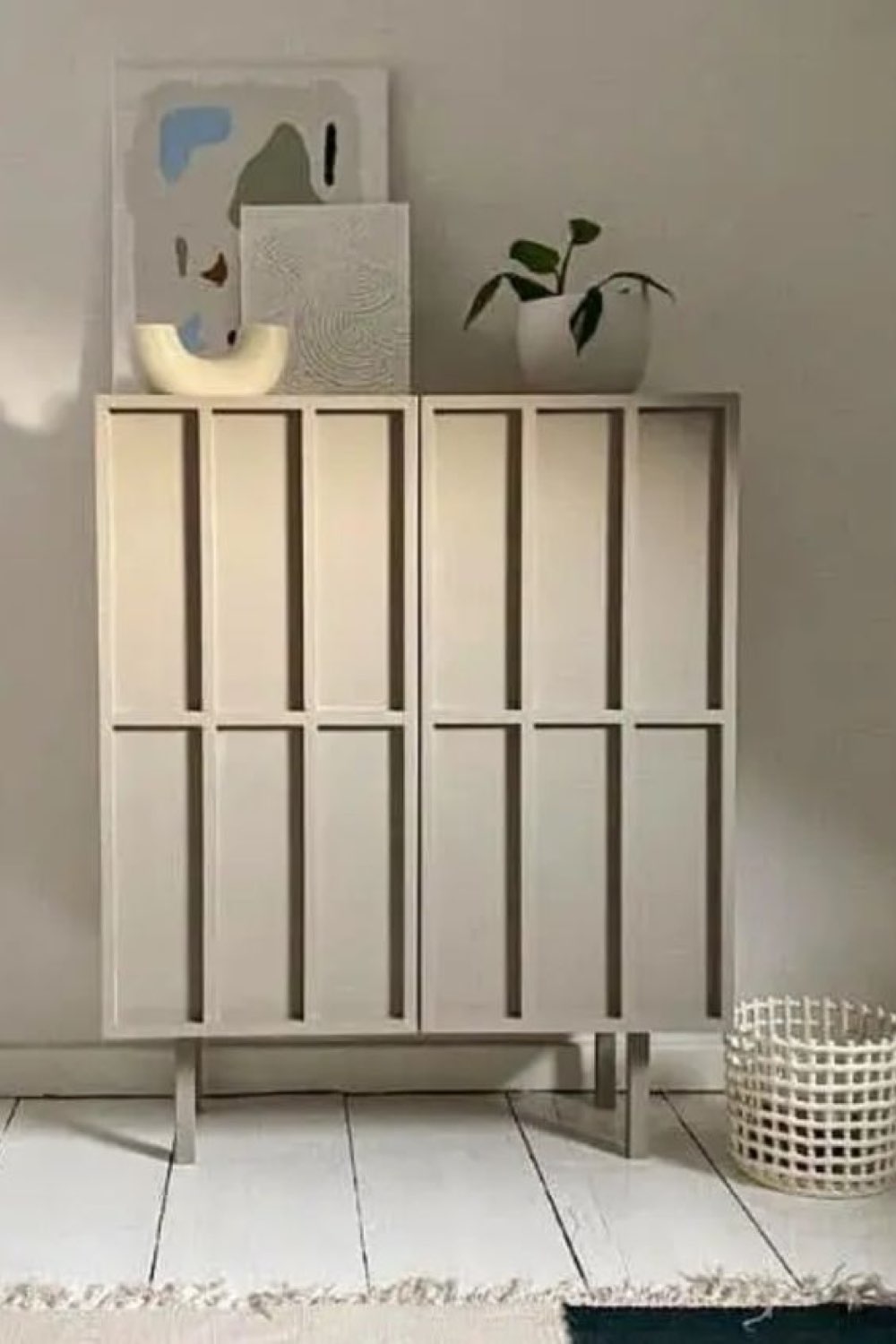 Dans le même esprit que la première idée, on va découper des formes dans un panneau de MDF. En revanche, ici les formes sont plus grandes et plus organiques afin de couvrir une grande partie des portes et des montants du meuble. La seconde différence réside dans la peinture vu qu'ici, ce sont deux couleurs qui sont utilisées, une pour le meuble et une autre pour les formes ajoutées. Même si les formes sont plus simples, ce hack est peut-être un peu plus difficile puisqu'il y a les arrondis à faire. Il vous faudra de la pâte à bois et un peu plus de ponçage pour un résultat propre.
