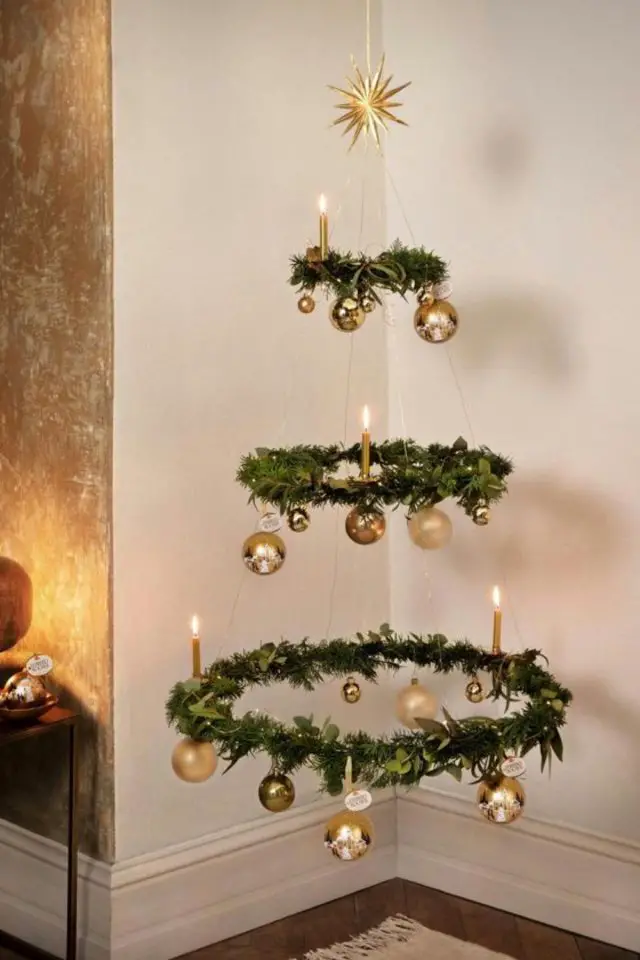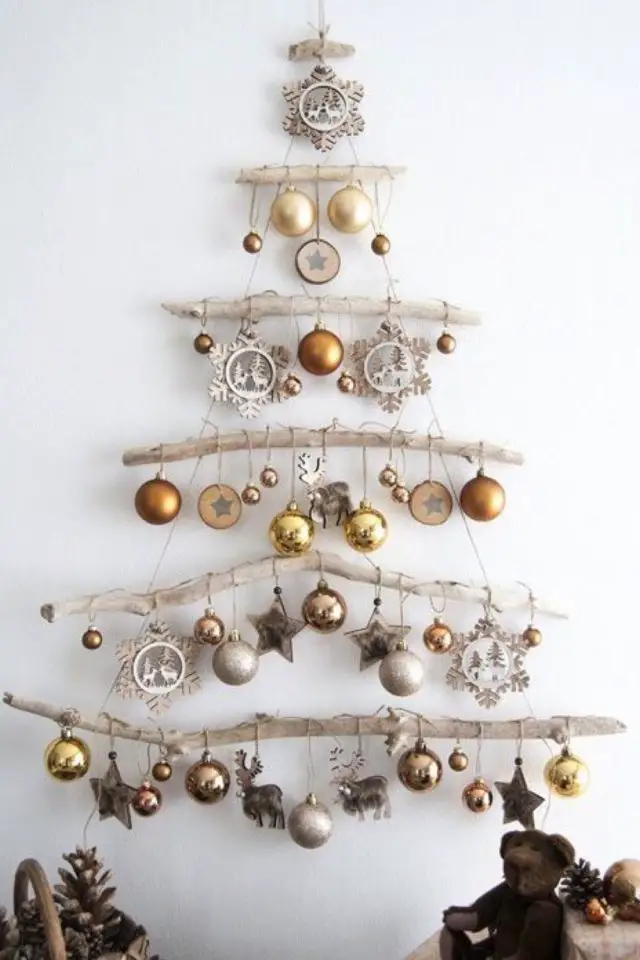 Encore un sapin sans sapin avec quelques branches d'arbre séchées suspendues avec du fil de nylon et décorées avec vos plus jolies déco de noël. Une chouette idée de déco murale qui peut très bien venir en complément d'un sapin classique.