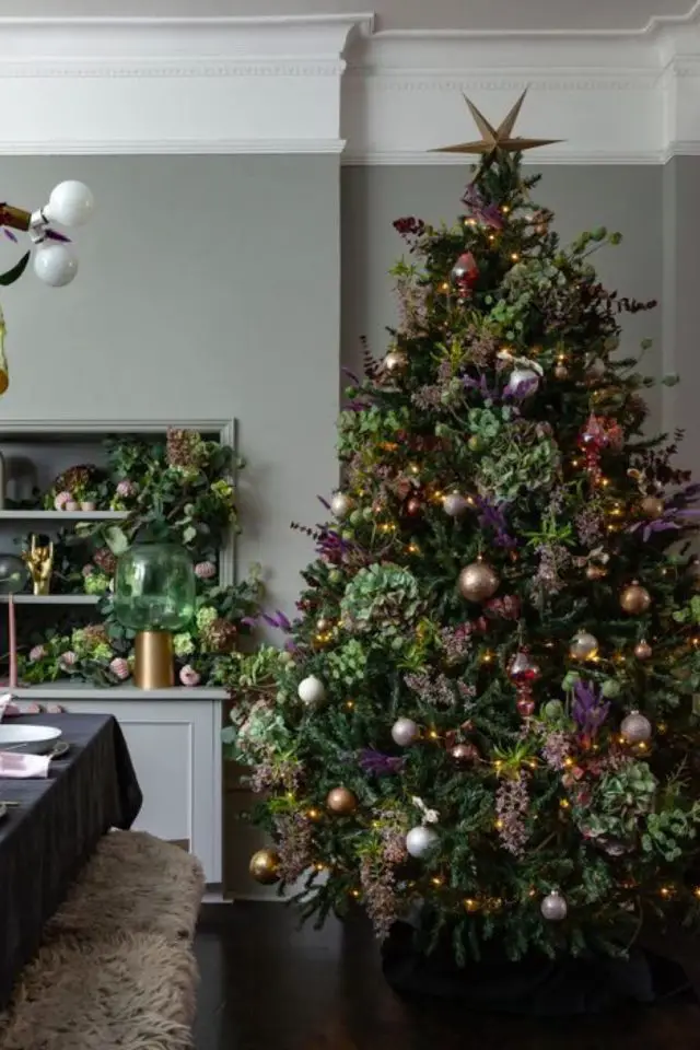 Un sapin décoré avec des plantes ou du moins des végétaux, ça ne court pas les rues. Mais c'est une idée... Ce qui est intéressant c'est l'idée de ton sur ton, vert sur vert qui permet de décorer beaucoup sans donner trop l'impression que l'arbre est surchargé.
