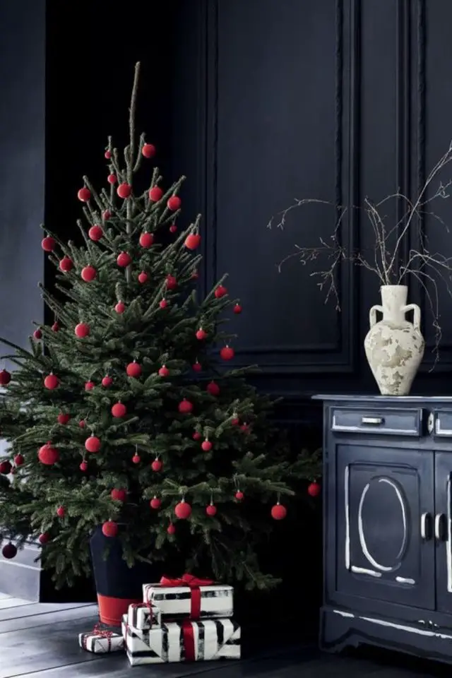 Minimaliste et traditionnel. On pourrait croire que c'est incompatible. Cependant ici c'est un bel exemple. Un arbre naturel, des boules de noël rouge et le tour est joué.
