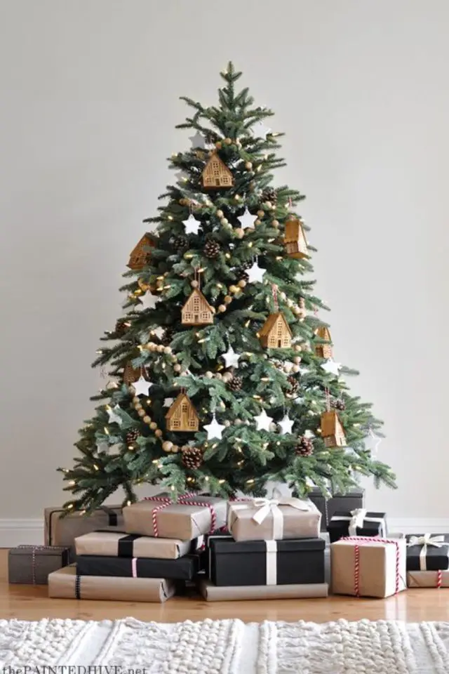 Des maisonnettes en kraft, des étoiles en céramique, une guirlande faite de billes en bois. On a un sapin traditionnel mais aussi moderne avec une touche DIY qui me parle bien.