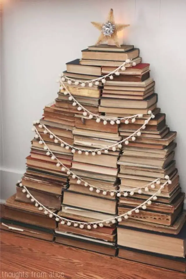 J'aime la récup' et j'aime quand les fêtes sont plus éco-friendly. Le sapin fait de vieux livres et décoré, ça me parle bien. On est loin de l'arbre traditionnel mais ce modèle ne finira pas à la poubelle ou brulé dans un feu de joie à la fin de la saison des fêtes.