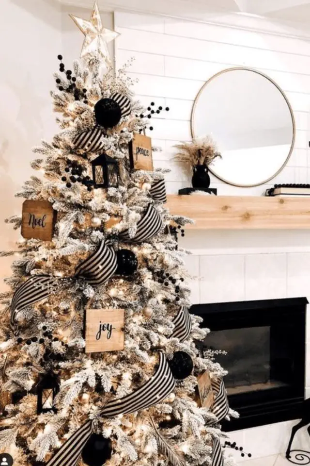Des branches blanches, des rubans noir et blanc au lieu des guirlandes, quelques boules noires et des mots gravés sur de petites plaques en bois. Cela donne un joli sapin de noël élégant.
