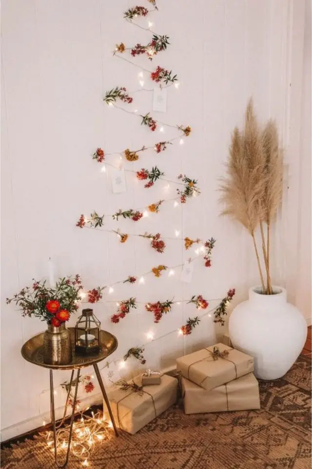 sapin de noel inspiration deco guirlande lumineuse fleurs séchée décoration murale facile