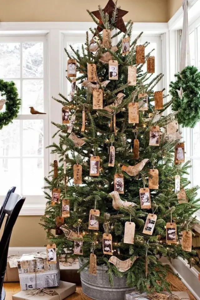 Quoi de mieux pour personnaliser votre sapin que des photos de famille? Ici elles sont collées sur des étiquettes en kraft et suspendues aux branches de votre arbre de noël. Je trouve que c'est une idée DIY sympa à copier.