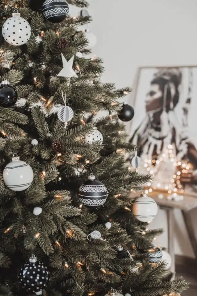 sapin noel decoration interieure boule noir et blanche étoile classique chic
