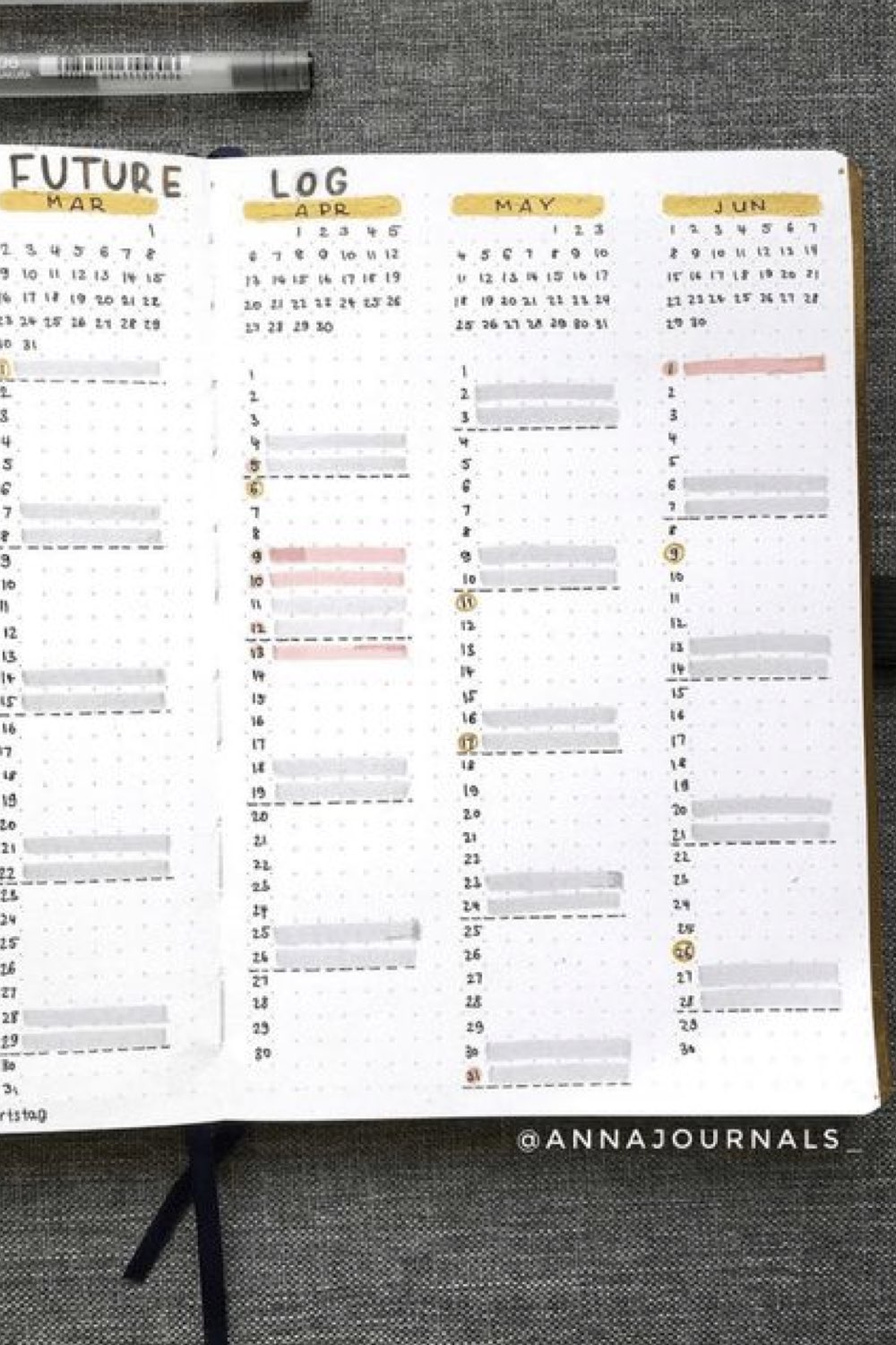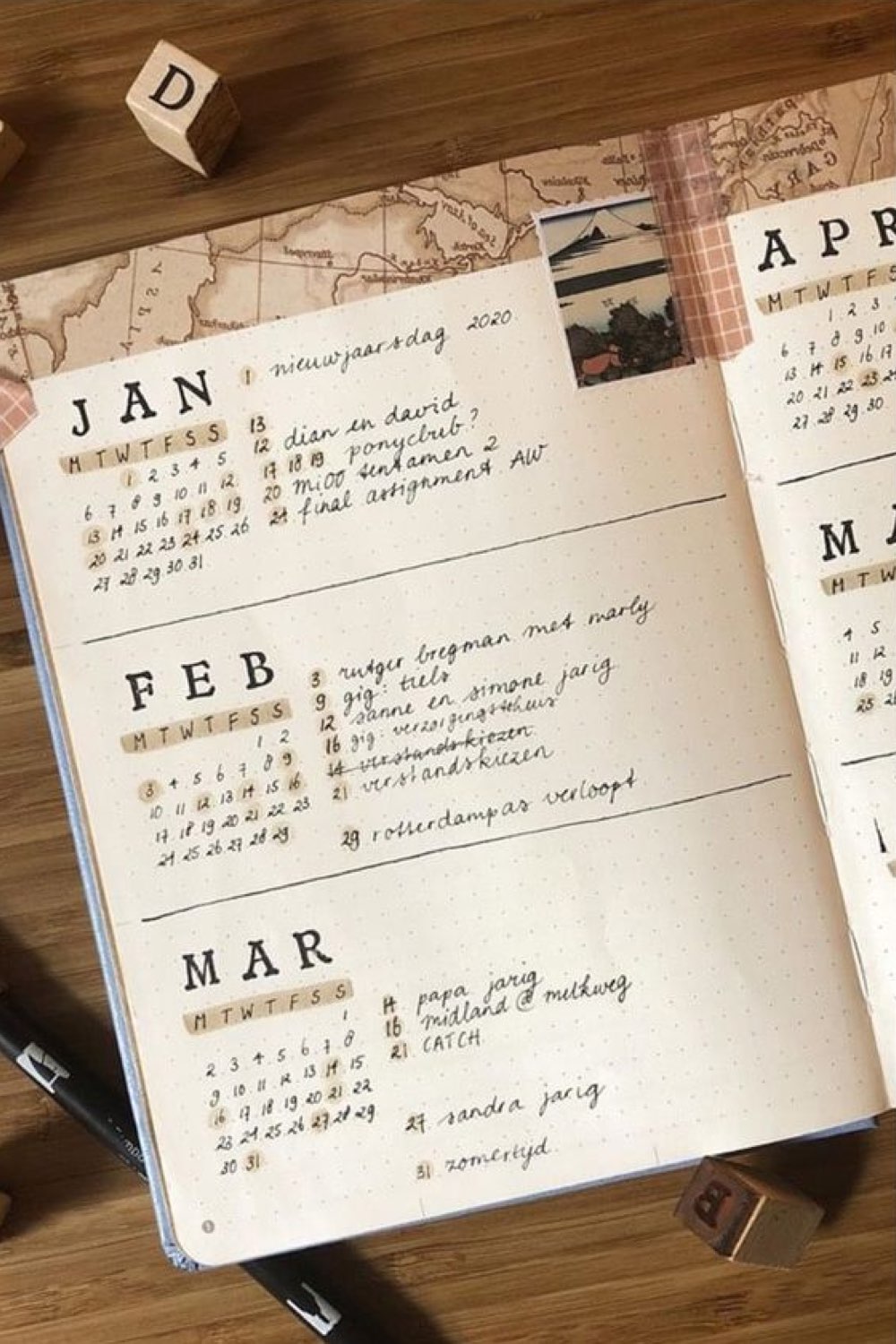 Normalement, chaque bullet journal commence par un index. Vous pouvez aussi ajouter un calendrier à l'année pour noter les événements importants comme les anniversaires, les dates de vacances, etc. C'est pratique pour voir en un clin d'oeil ce qu'il ne faut pas oublier. Ensuite, il y a le calendrier du mois où on reporte les dates importantes puis le calendrier journalier. Souvent, pour le samedi et dimanche, on utilise moins de place... Mais si vous avez des week-ends chargés, ce n'est peut-être pas une bonne idée.