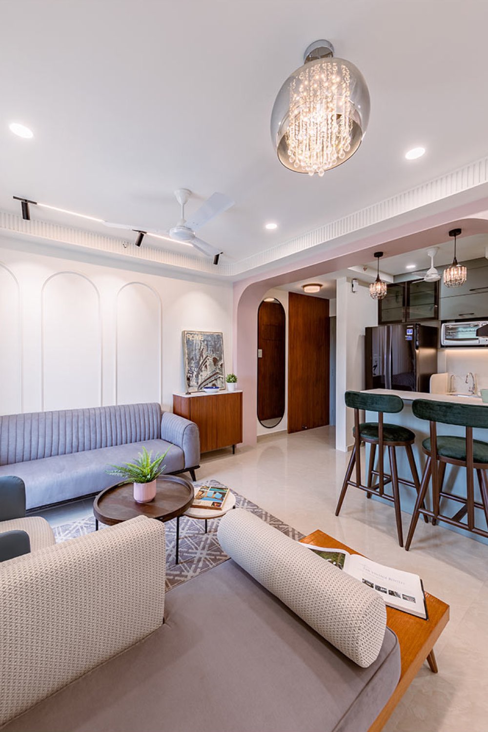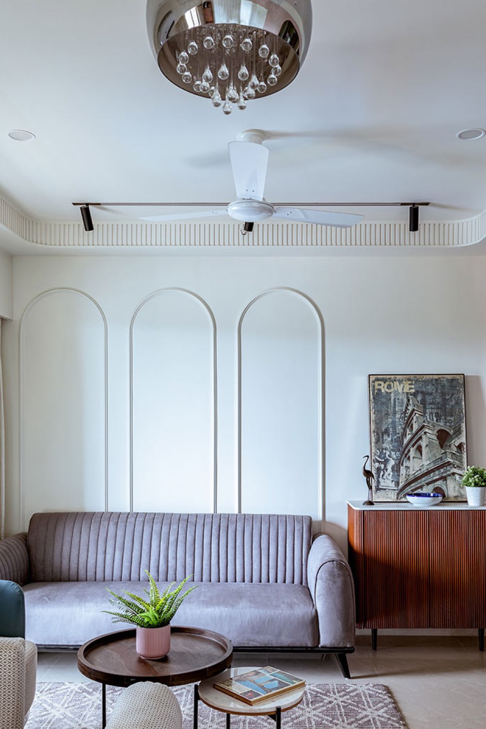- Des arches en moulures et en ton sur ton à l'arrière du canapé;