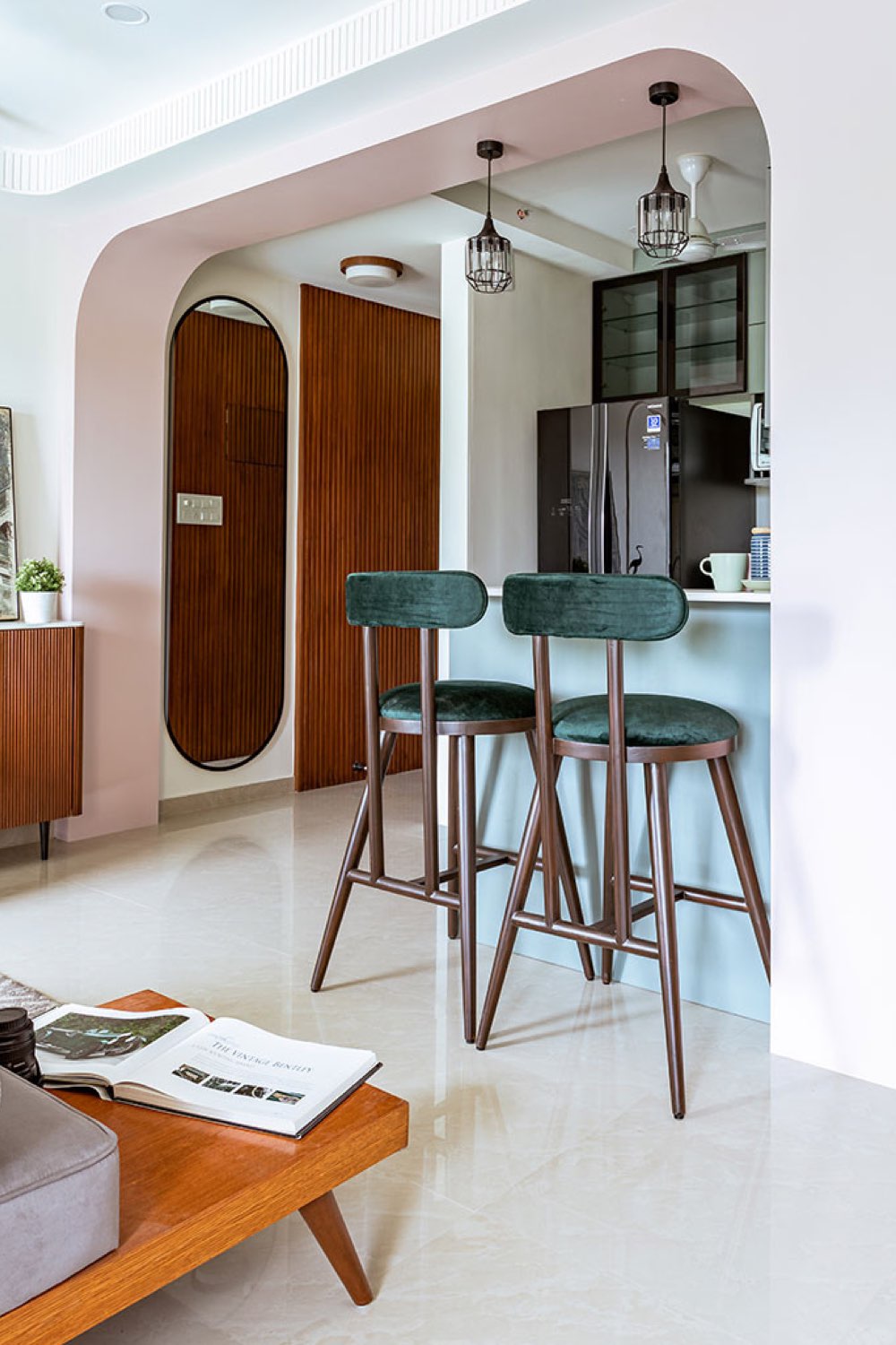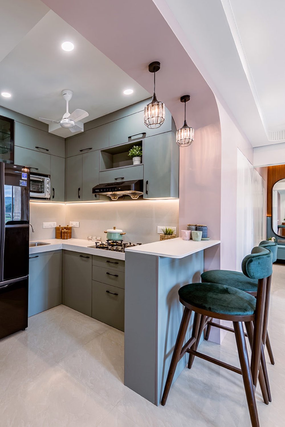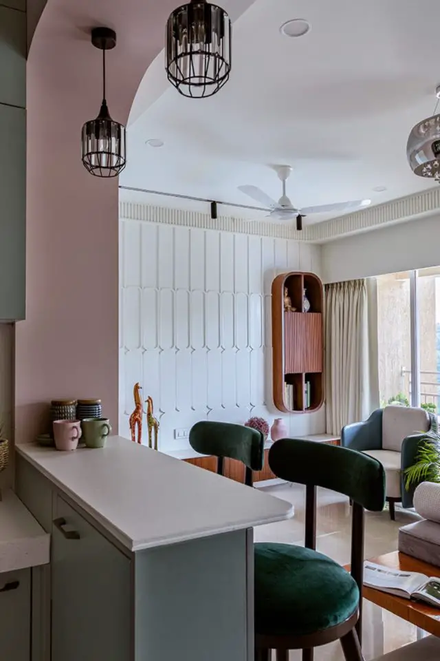 Enfin, je voulais attirer votre attention sur la kitchenette ouverte sur le séjour. Je viens d'évoquer l'arche qui crée du lien entre les différents espaces mais ce n'est pas son seul atout. Le choix a été de la colorer. Un vert sauge moderne et très doux. Comme elle est ouverte et compacte, elle rayonne sur le reste de la pièce de vie. C'est une manière différente d'apporter de la couleur, un point précis mais dont on profite librement peu importe où l'on se trouve dans la pièce.