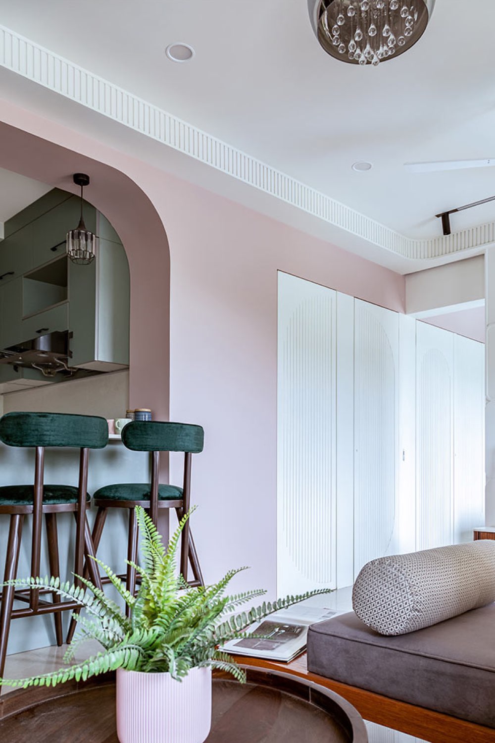 Le rose est un peu plus présent dans ce petit logement. On le trouve sur un mur de la chambre, pour colorer la voute qui sépare l'entrée du reste de l'appartement. Cette voute est intéressante à regarder de plus près. Elle ne comprend pas que l'espace de passage entre les pièces, elle englobe aussi l'ouverture arrondie de la cuisine. Elle fait le lien (couleur et forme) entre les 3 espaces ouverts les uns sur les autres. Le rose colore aussi la porte coulissante qui donne sur la chambre.