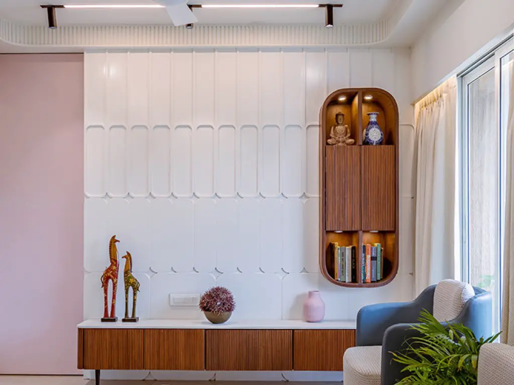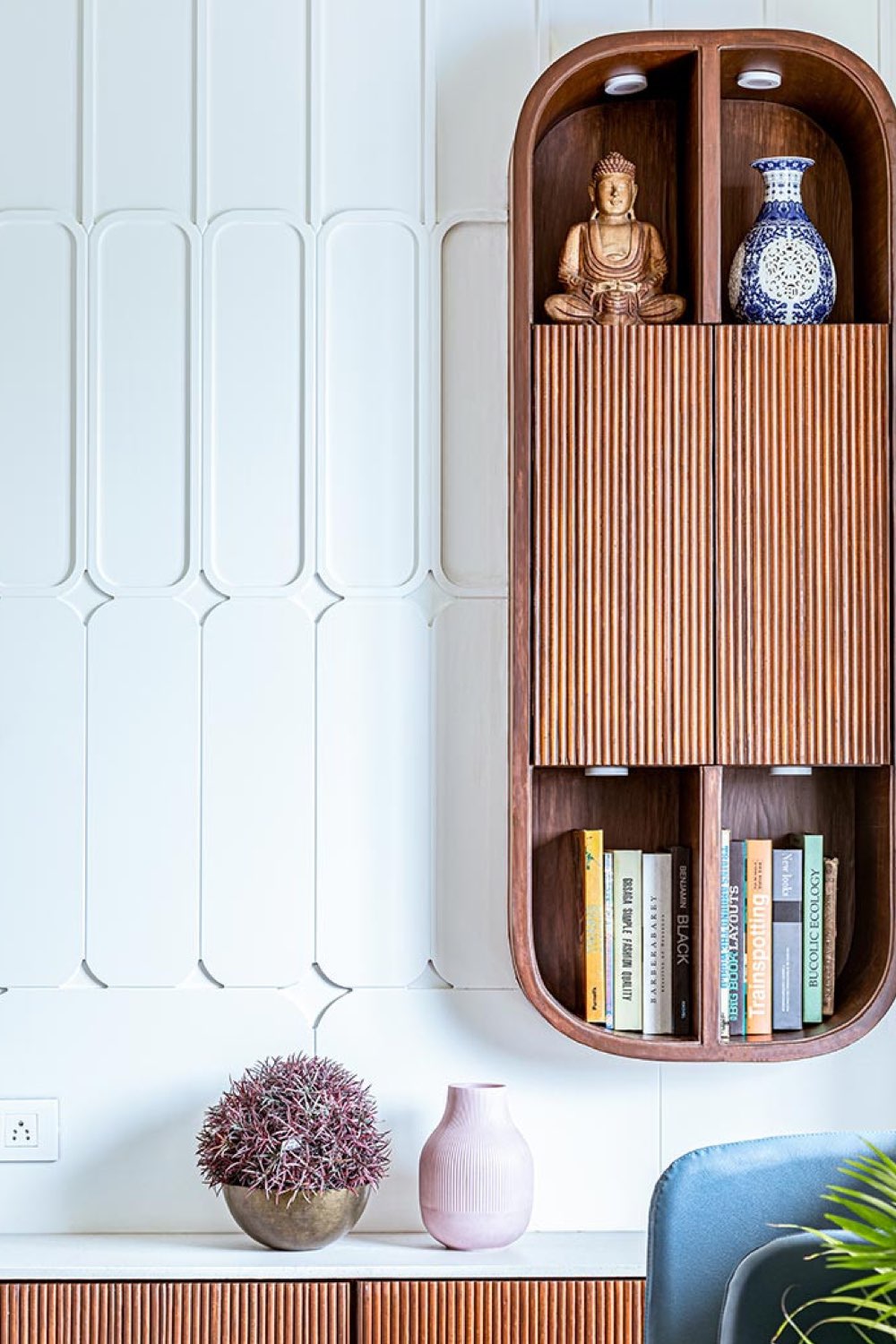 - Un petit meuble de rangement mural en bois avec un relief en cannelage;
